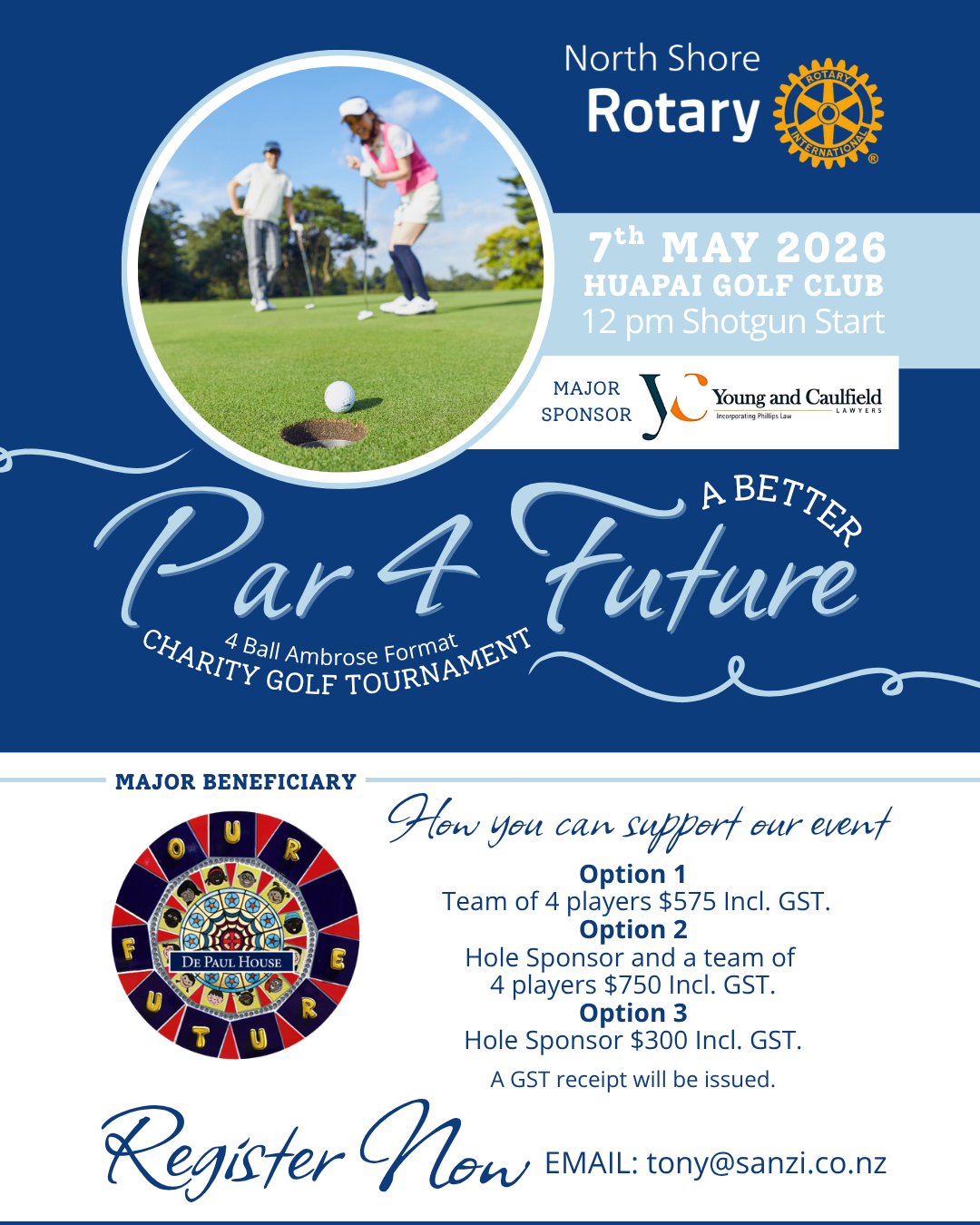On Thursday, 7th May 2026, North Shore Rotary, in association with our major sponsor, Young & Caulfield, will hold our Par 4 a Better Future charity golf (Ambrose) tournament at Huapai Golf Club.